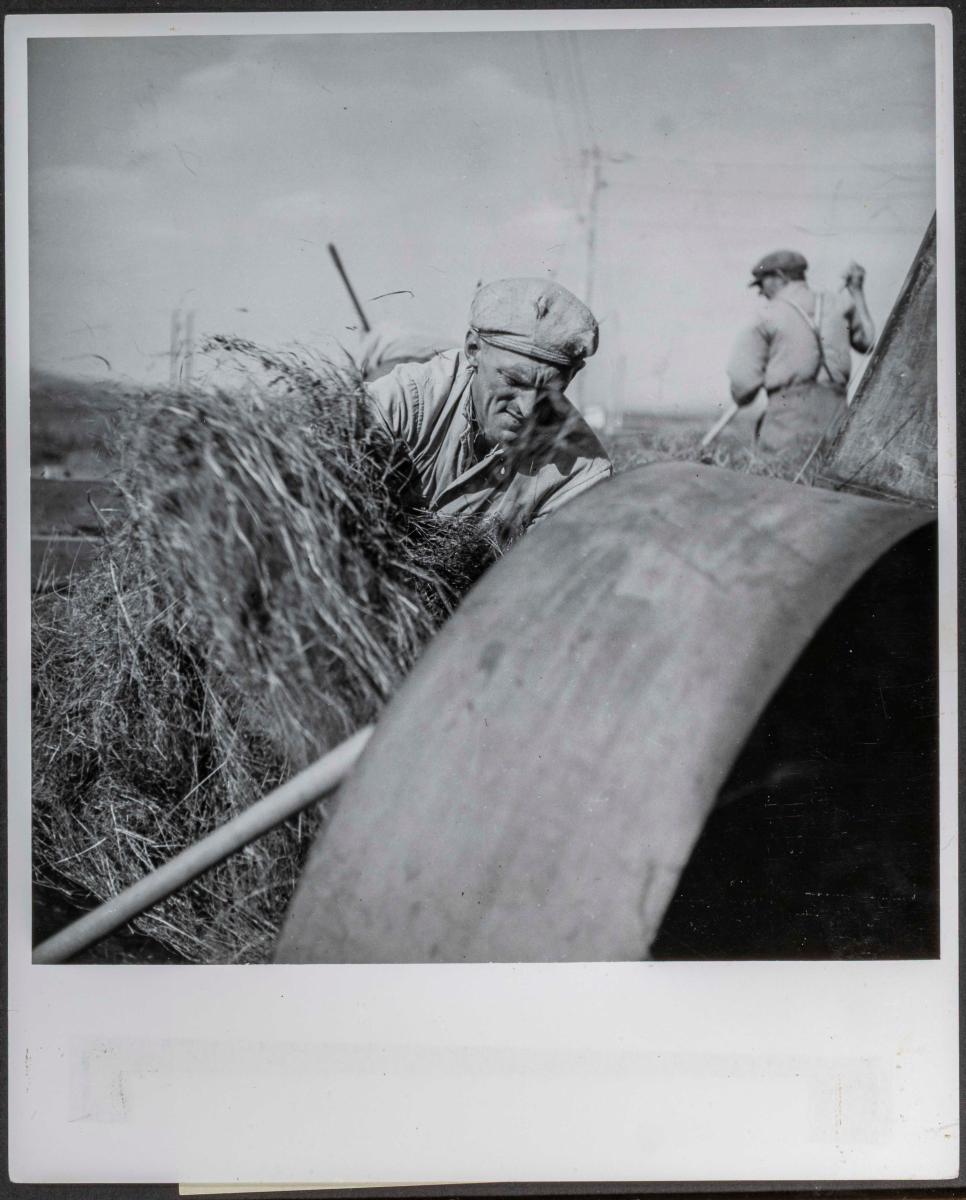 Verið er að hirða þurrhey í hlöðu eða fúlgu, fremst sér í heyblásara og við hann er karlmaður að moka þurrheyi að honum, fjær er annar karlmaður með heykvísl.