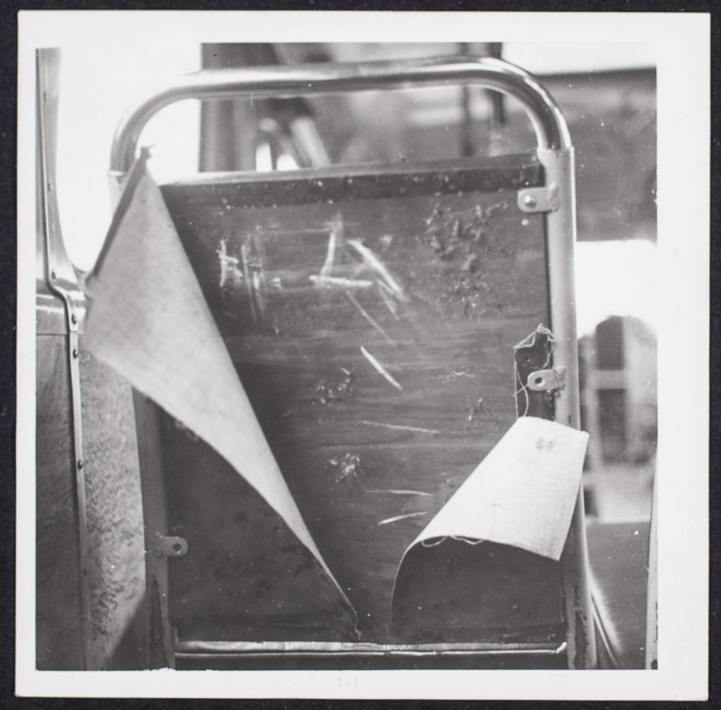 Rifið stólbak í strætisvagni.
