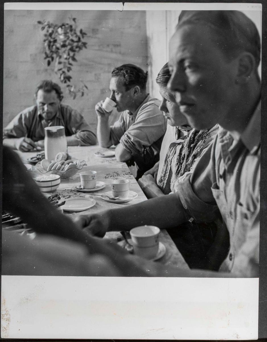 Nokkrik karlmenn á ýmsum aldri sitja við kaffiborð, sjá má diska með mjólkurkexi og brauðsneiðum. Blómaplanta hangir á vegg í bakgrunni.