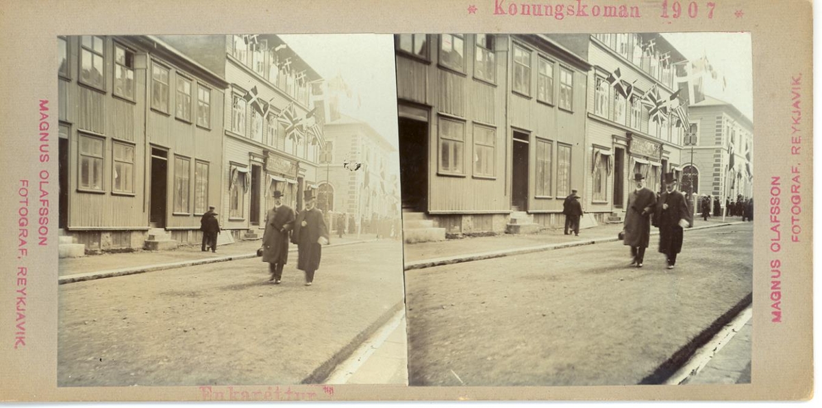 Stereoskópmynd. Í forgrunni ganga