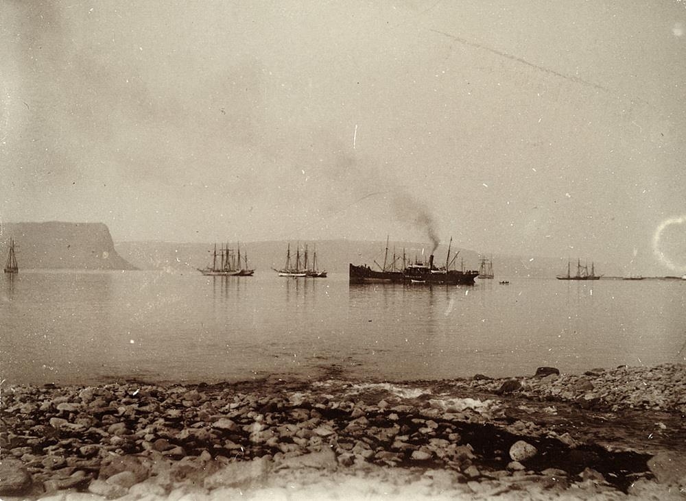 Gufuskipið er líklega Skálholt. Fjöll í baksýn.