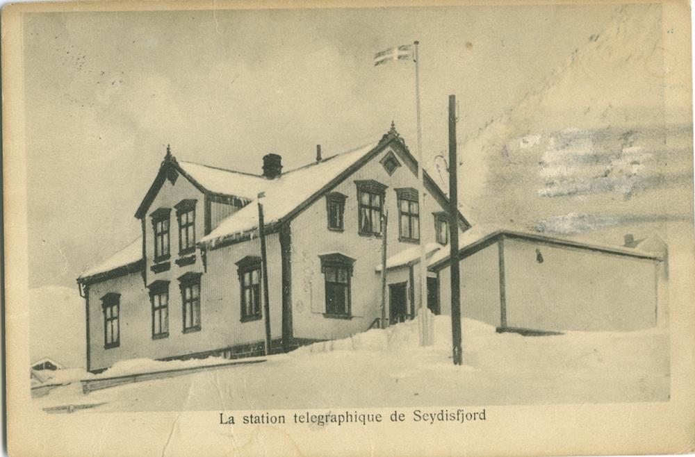 Myndin sýnir símstöðina á Seyðisfirði. Flaggað er fyrir utan, en það er snjór yfir öllu. Fjall í baksýn. Undir myndinni stendur á frönsku: La station telegraphique de Seydisfjord.
