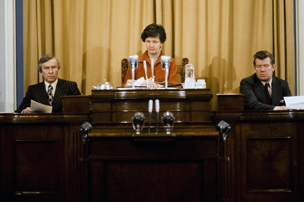 mynd af ræðustól og forsæti neðri deildar. Í forsætinu er Ragnhildur Helgadóttir.