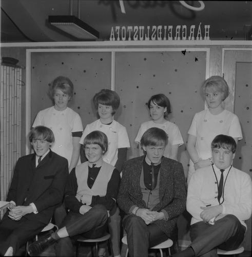 Tekið á hárgreiðslustofu. Fjórir karlmenn sitja með nýlagt hárið. Aftan við þá standa fjórar hárgreiðsludömur í hvítum sloppum.