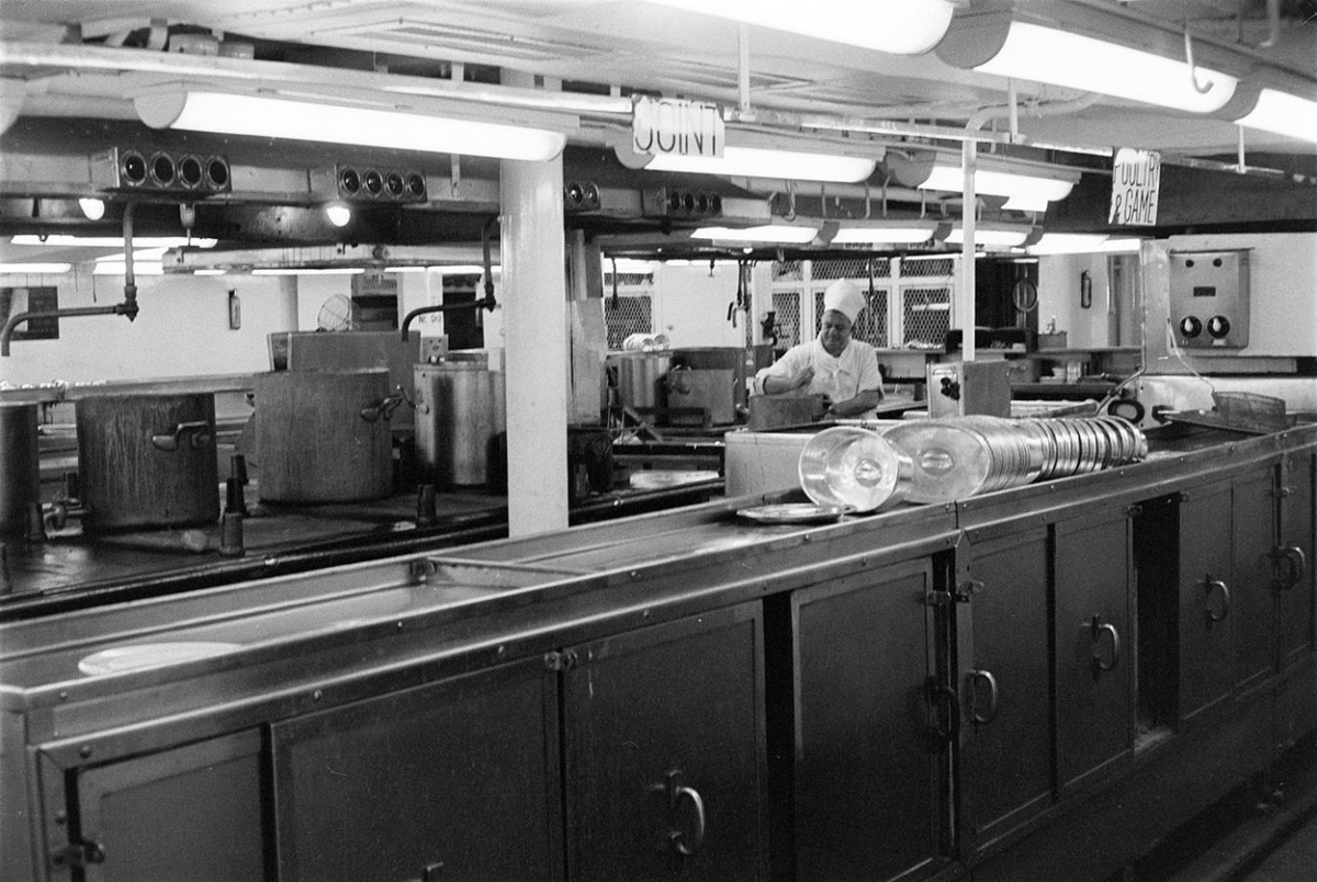 Tekið í eldhúsi um borð í skipi. Kokkkurinn stendur við pott. Á eldavélunum er fullt af pottum.