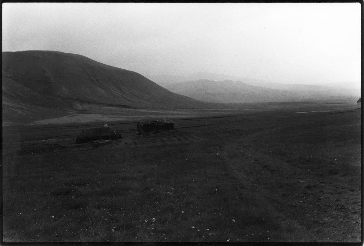 Tvö torfhús á grónum velli, yst