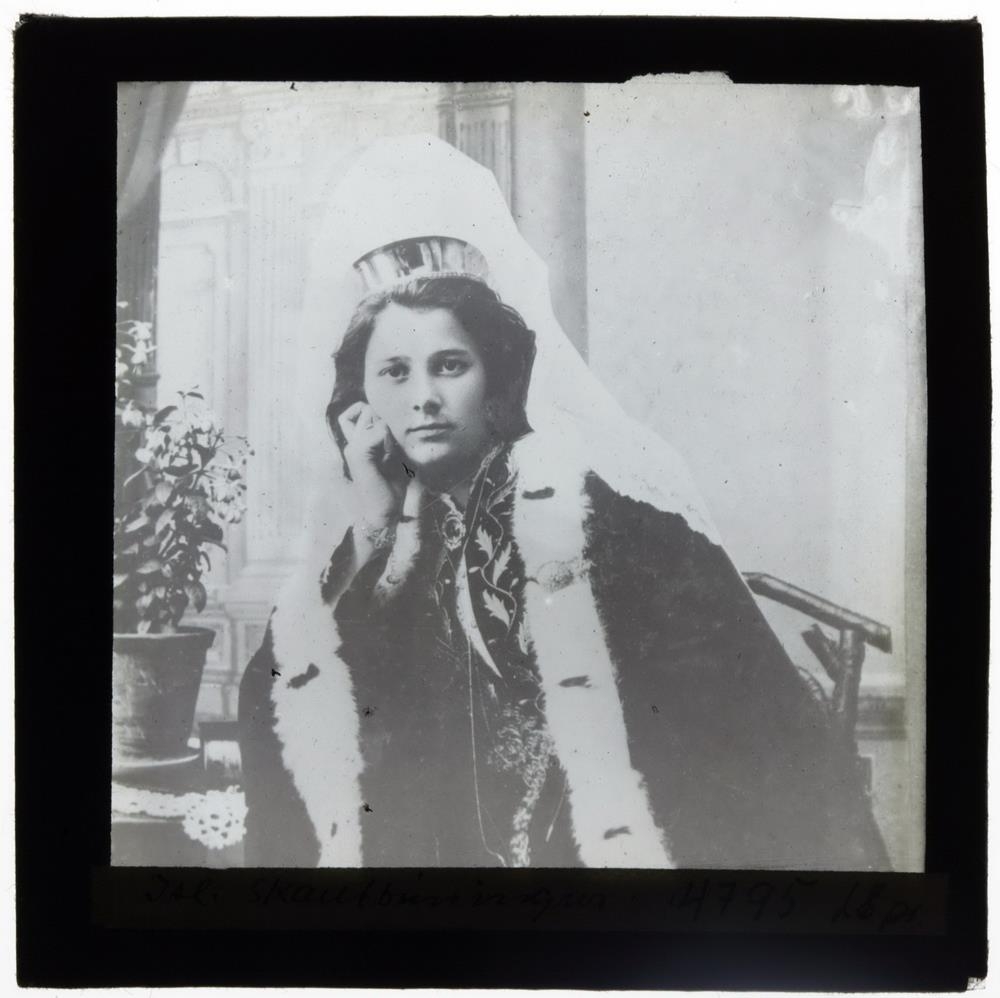 4795. Kona í skautbúningi og kirtli. Pottablóm á borði við hlið hennar.