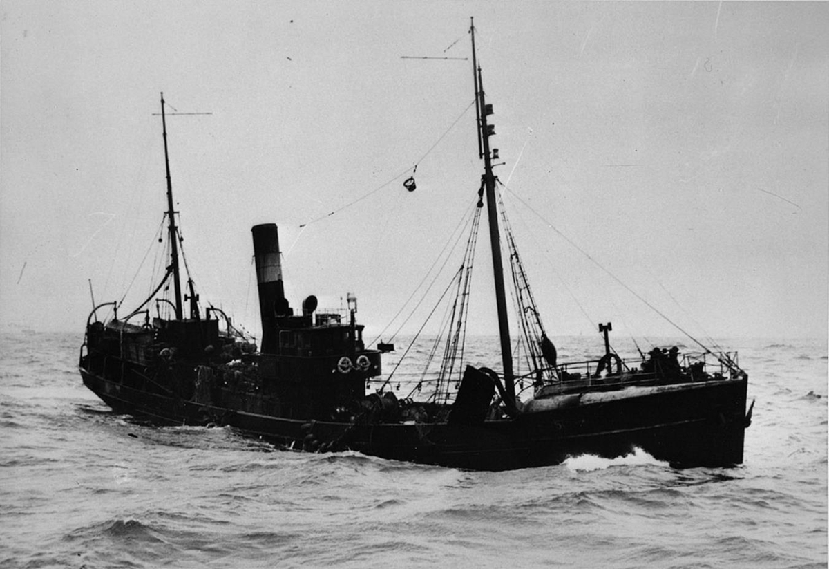 Gufuknúinn síðutogari, séð skáhallt framanfrá á stjórnborða. Á bakhlið er skrifað: „Apríl RE 151“.