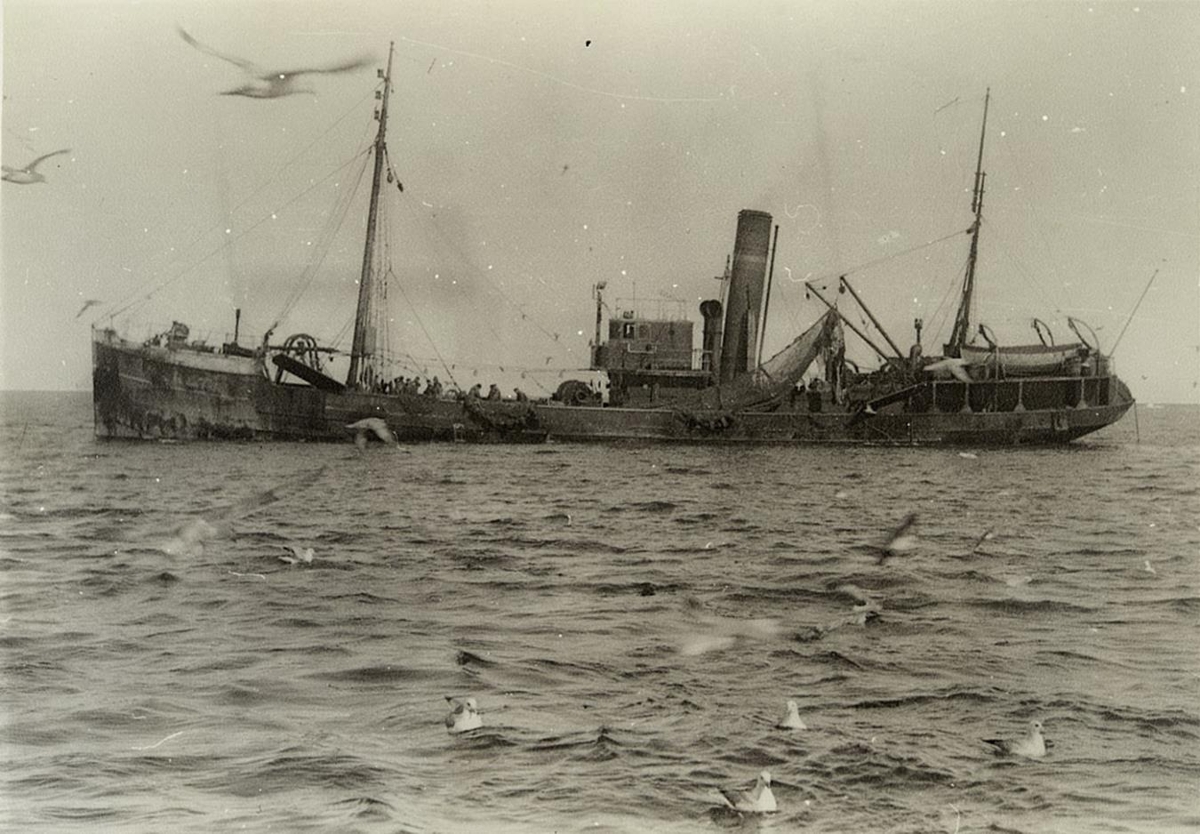Gufuknúinn síðutogari, séð þvert á bakborða. Á þilfari eru sjómenn í aðgerð. Á bakhlið er skrifað: „Ólafur? Þýzkbyggður RE? (7?)“.