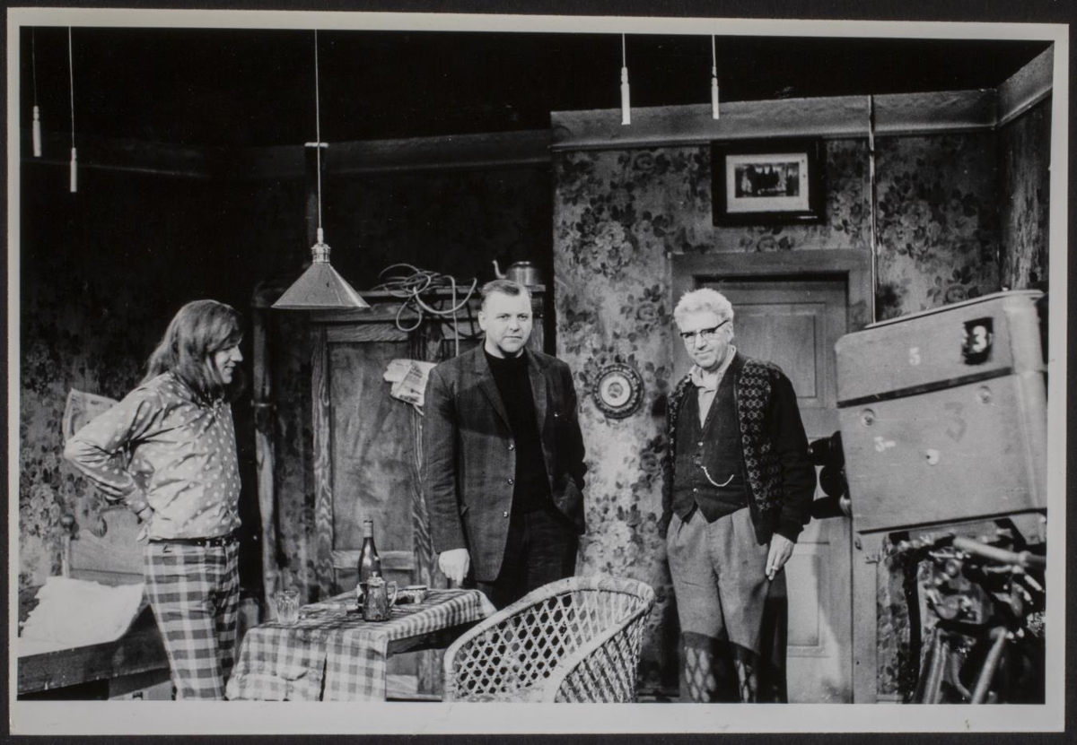 „Frá hægri: Gísli Alfreðsson, Matthías Jóhannessen og Valur Gíslason. Sjónvarpsupptaka af Jóni Gamla eftir Matthías1968?“ (PBB 2023)