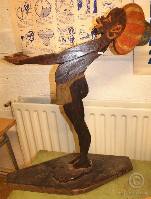 Tréstytta af dökkri konu, þjónustustúlku sem á að halda á bakka úr tré, bakkinn er ekki til staðar. Styttan er heimasmíðuð frá Nýjabæ í Garði. Fyrri eigandi var Una Guðmundsdóttir (1894 - 1978) frá Sjólyst í Garði.