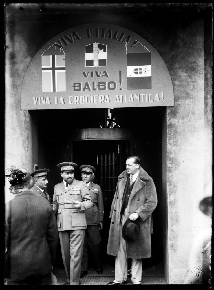 Fjórir menn í dyragátt. Yfir dyrunum er letrað VIVA BALBO VIVA LA CROCIERA ATLANTICA. Balbo flugkappi annar fv. og Eggert Stefánsson söngvari th. Hnattflugið 1924.
