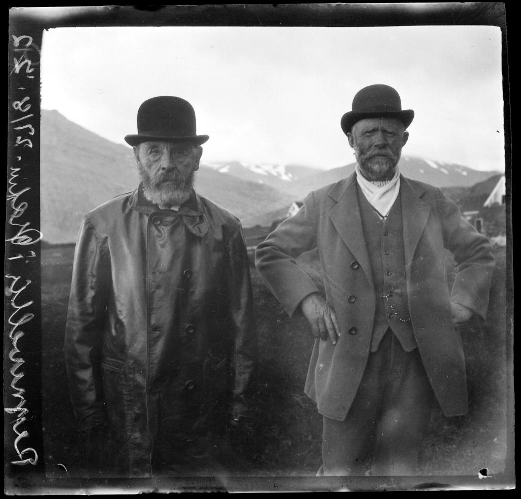618. Reynivellir. Borgarhafnarhreppur. Tveir menn með kúluhatta, annar í regnfrakka en hinn í jakkafötum standa með torfbæ í baksýn. Heimreið frá Djúpavogi ágúst 1922. Á filmuna er skrifað Reynivellir í Öræfum 27.8.22. Pétur Jónsson t.v.