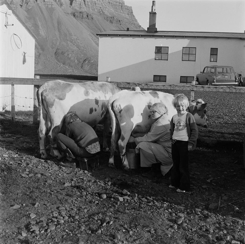 Mjólkað í stöðli á Finnbogastöðum. Aðalbjörg Albertsdóttir mjólkar.