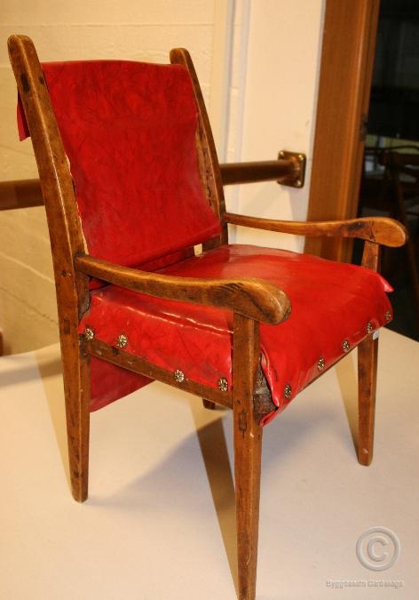 Dúkkustóll fyrir börn til að leika sér með. Stóllinn er með rauðu plastáklæði. Málm pinnar notaðir til að festa niður áklæðið og stólinn saman. Áklæðið lítur vel út en er laust á bakinu. Hollvinafélag Unu Guðmundsdóttur frá Sjólyst í Garði, létu lagfæra stólinn. Skipt var m.a. um áklæði svo lýsingin á áklæðinu á ekki lengur við. Stóllinn var í eigu Unu Guðmundsdóttur (1894 - 1978) frá Sjólyst.