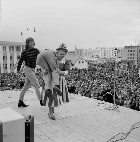 Tekið á Arnarhóli. Tveir karlmenn og ein kona á sviði. Konan heldur á öðrum manninum á öxlum sér. Mikill mannfjöldi er á svæðinu og fylgist með. Fjær sér í hús.