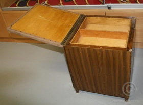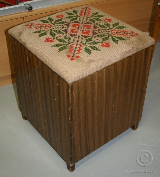 Skemill með rúmgóðum geymsluhólfum. Á lokinu er útsaumuð mynd í jafa. Ástand fremur lélegt.