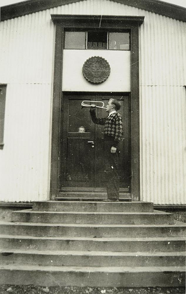 „Sá sem blæs í lúðurinn er Jónas Gíslason, síðar vígslubiskup í Skálholti. Myndin líklega tekin sumarið 1947 þegar Jónas var ráðinn aðstoðarmaður Magnúsar Runólfssonar í Vatnaskógi. Merkið ofan við dyrnar er merki Skógarmanna KFUM. Á það eru einnig skráð einkunnarorð Skógarmanna: Áfram að markinu. Bjarni Ólafsson skar merkið út. Myndin er tekin á tröppum "Gamla skála" sem vígður var sumarið 1943, en myndin líklega frá 1947.“ (ÞB 2024)