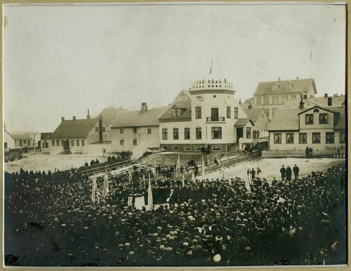 og heldur ræðu. Í baksýn er húsaröð og liggja húsgarðar niður halla að