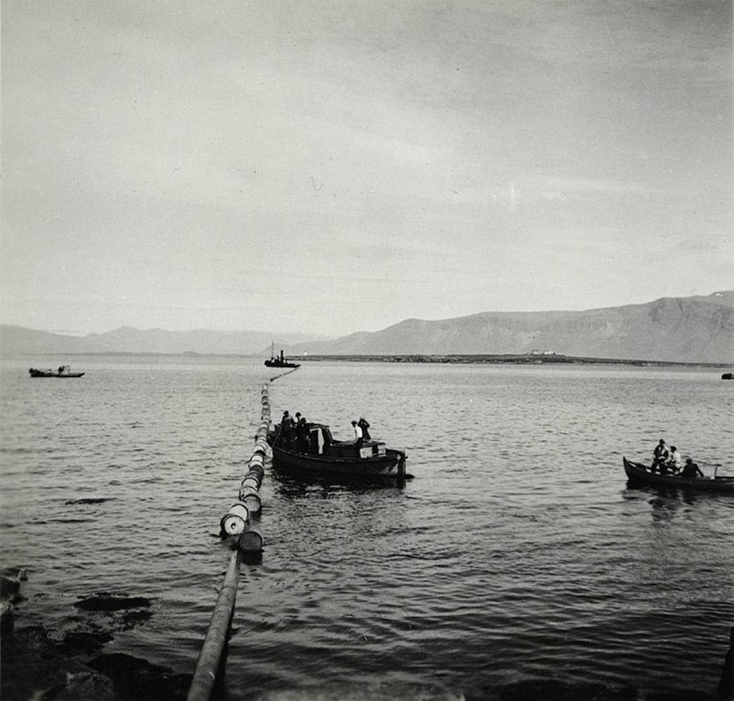 Úti á sundinu er dráttarbátur við enda leiðslunnar og er greinilega að
