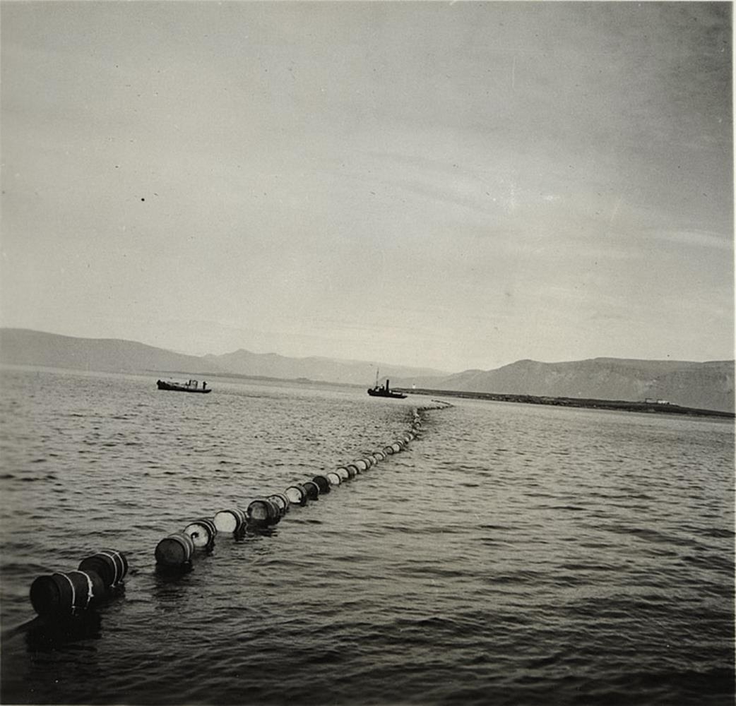 sem liggur út í sjó og er haldið á floti með tómum olíutunnum. Úti á sundinu