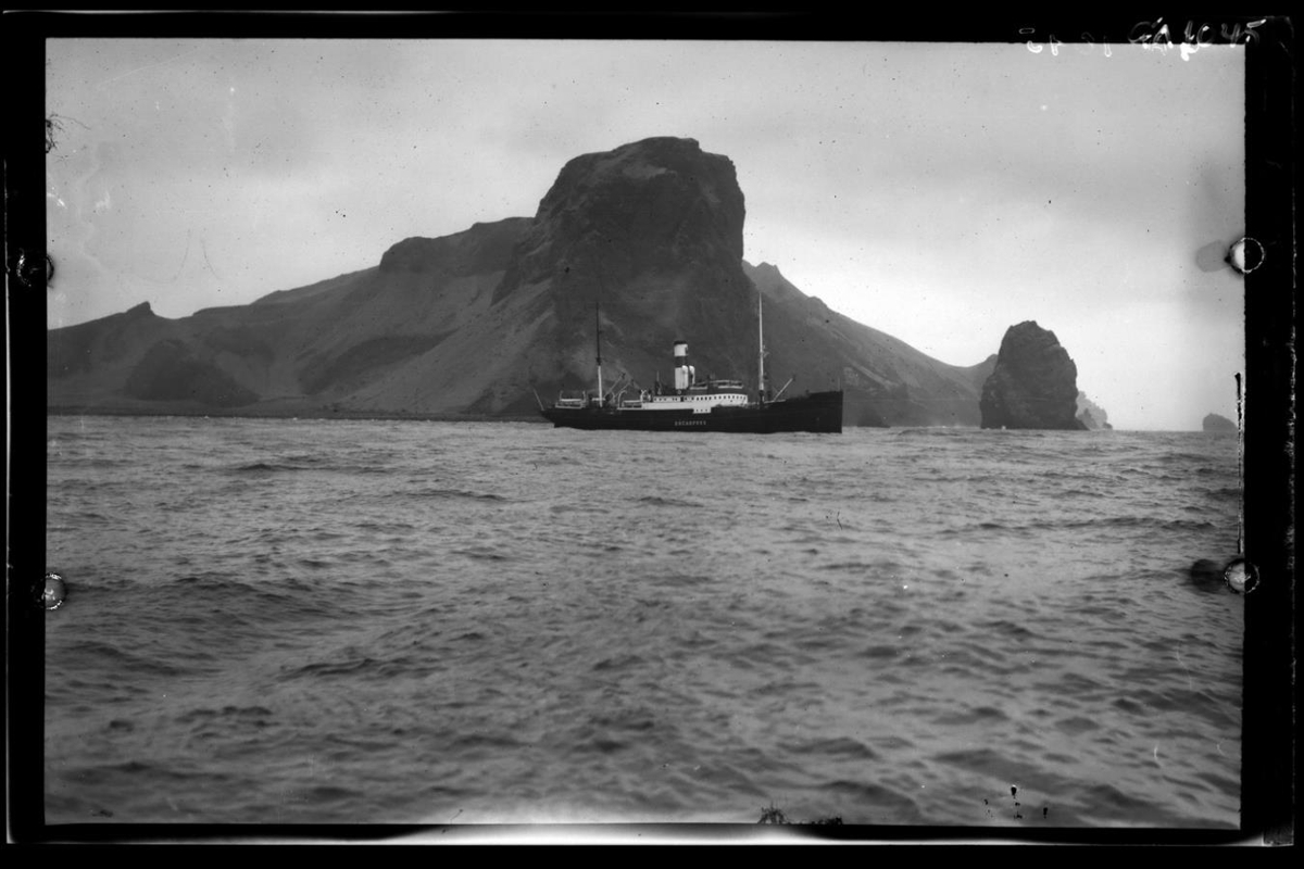við Heimaklett. Skipið siglir vestur sundið.