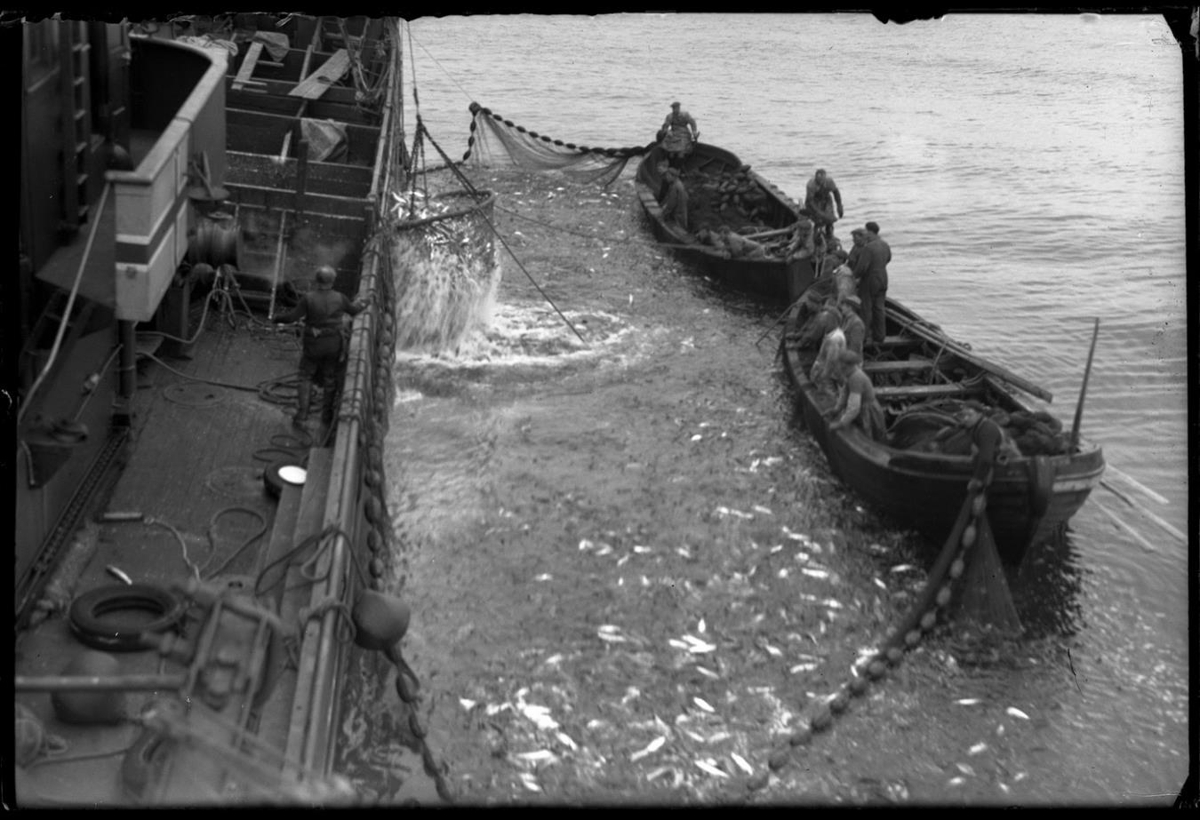 Togari að síldveiðum. Tveir nótabátar og nót við síðuna. Verið að háfa. Ísl. fáninn málaður á brúarvæng. Maður á dekki, sem er hólfað sundur með fjölum.