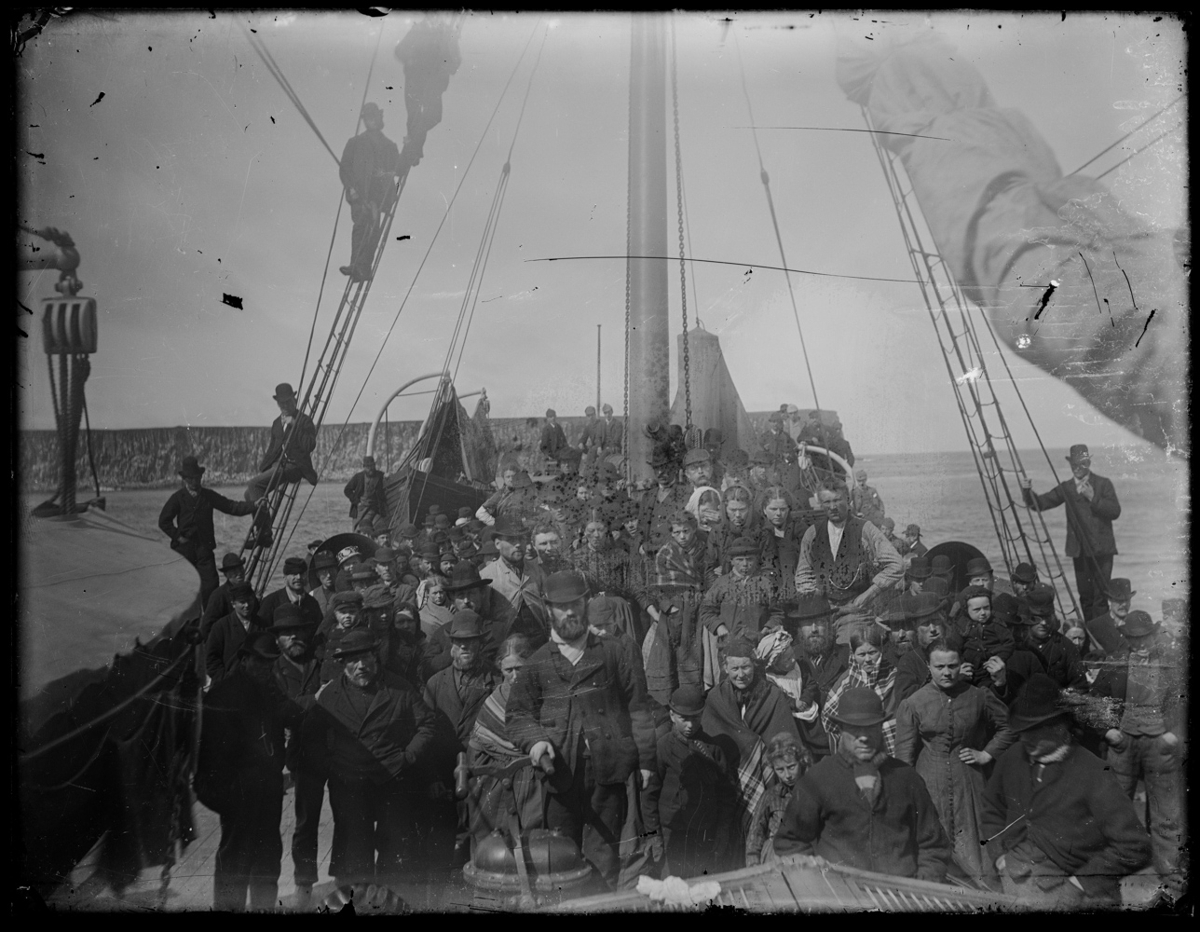 Stór hópur fólks á dekki og nokkrir hafa klifrað upp í stög. Sér í klettavegg í bakgrunni. Vesturfarar um borð í Camoens..