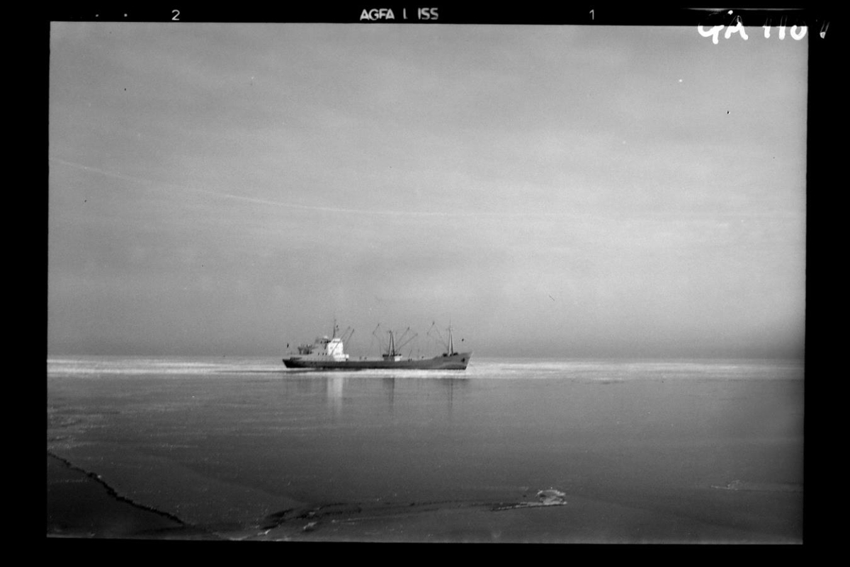 Flutningaskip á siglingu í nokkurri fjarlægð, við ísröndina. Þetta er m.s. TRÖLLAFOSS.