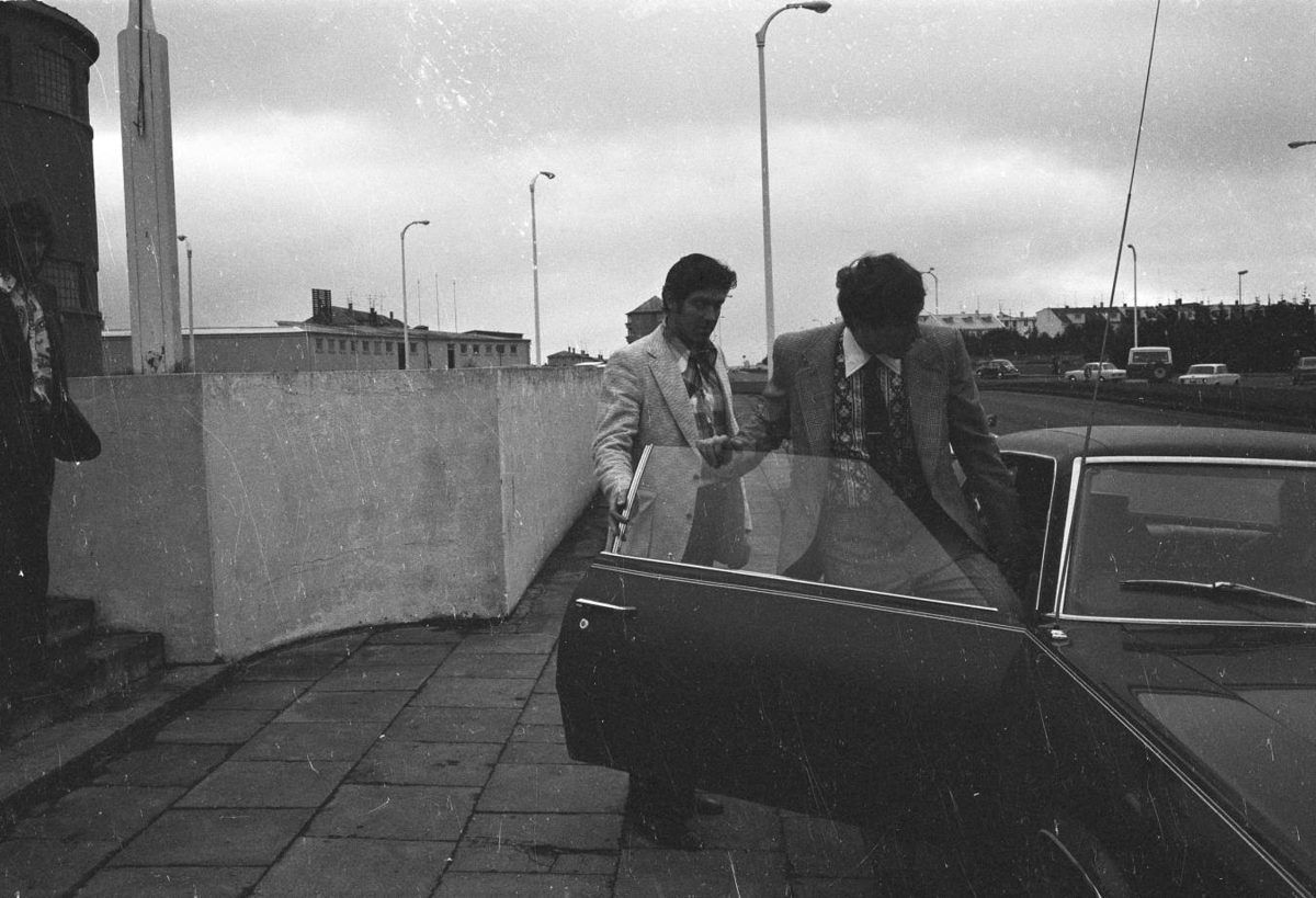 Fischer skrifar nafnið sitt á taflborðið rétt fyrir brottför.