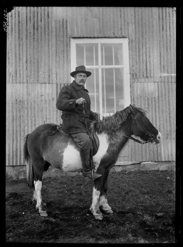 Vilhjálmur Gíslason í Ásabergi á Eyrarbakka með hest.