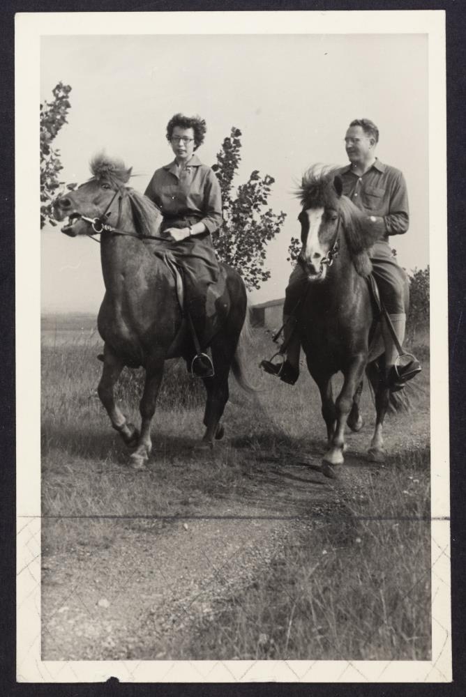 Kona og karlmaður á hestbaki. Yfirskrift greinarinnar með myndinni er: Veitum hestinum aftur forna virðingu. Eftir Gunnar Bjarnason, Hvanneyri. Undir myndinni stendur: Gunnar Bjarnason kennir þýzkri reiðkonu "tökin á töltinu" á reiðvegi í nágrenni Bonnar (Myndin er tekin í júní s.l.). (sjá mynd no. 475 og 467)