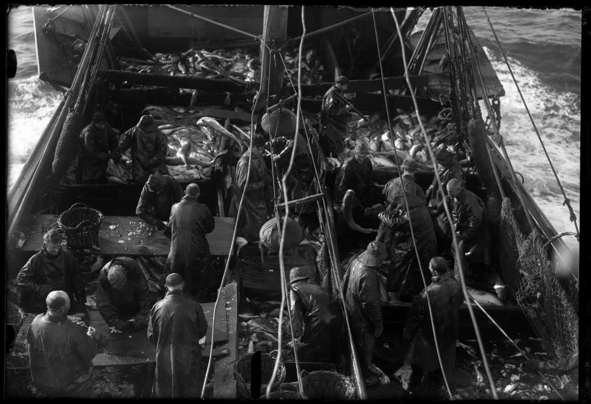 Fiskaðgerð um borð í togara. Sjóklæddir menn, sumir með sjóhatta en aðrir berhöfðaðir. Flatningsborð, tágakörfur, haki, vinnuljós, toghleri, troll. Dekkið hólfað sundur með fjölum.
