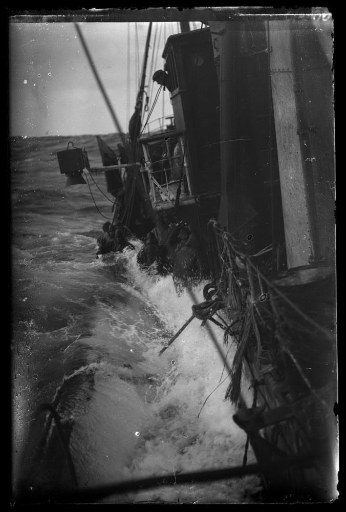 Tekið um borð í togara og sér á hann bakborðsmegin, frameftir skipinu. Það tekur inn á sig sjó. Verið að taka inn trollið. Sjóklæddir menn á dekki. Maður með derhúfu hallar sér út um brúarglugga. Lanterna út frá brúarvæng.