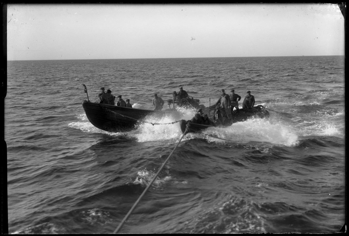 Að sögn eru þetta nótabátarnir af Ver GK 3. Í báðum sést áhald, s.k. rúlla, og hvílir nótin á þeim og milli bátanna. Verið er að draga bátana að síldartorfu. Heimildarmaður telur að myndin sé tekin árið 1929.