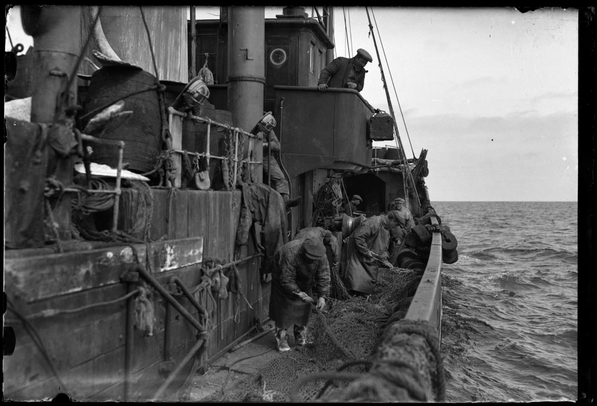 Menn við netabætingu um borð í togara. Maður á brúarvæng. Sést á skipið stjórnborðsmegin frá keis og fram eftir. Trébobboingar á borðstokk, lanterna á brúarvæng, tunna aftarlega á keis.