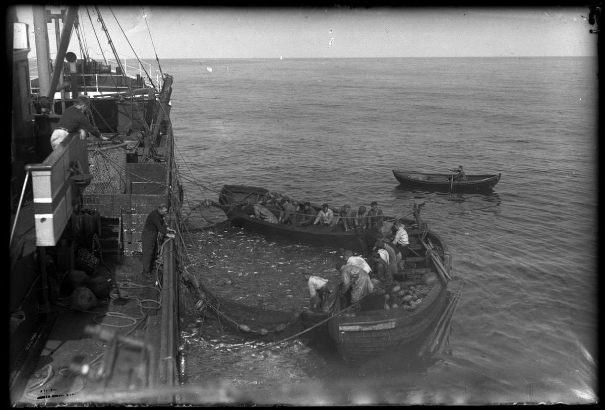 Haraldur Þórðarson, 1. stýrimaður er á brúarvæng. Sigurjón Einarsson, skipstjóri, stendur á þilfari. Maður á ljósum stakk í nótabát fjær á mynd er Kristinn Þorsteinsson, háseti. Litli báturinn er léttbáturinn af Garðari, en á honum er Einar Sigurjónsson, sonur skipstjóra, en hann fékk að fljóta með sem slíkur. Hér er verið að "þurrka upp" sem kallað var, þrengja að síldinni.