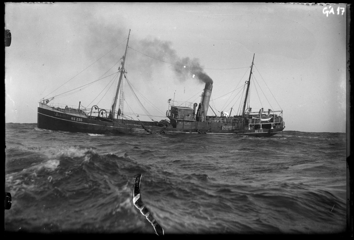 Togarinn Gylfi RE 235 að veiðum. Sést á hlið. Rýkur úr strompi.