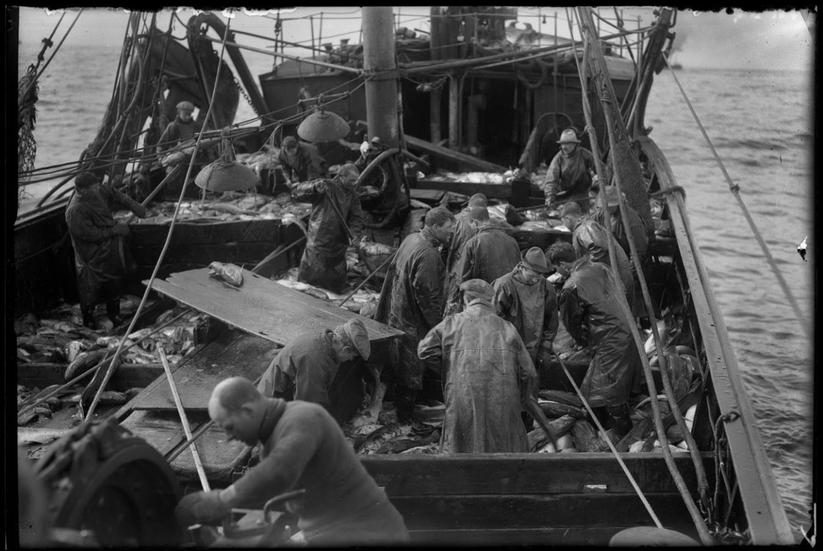 Tekið um borð í togara og sér frameftir skipinu. Þilfarið hólfað sundur og fiskur á dekki. Sjóklæddir menn, einn á peysu. Sumir berhöfðaðir, aðrir með derhúfur, hatta. Flatningsborð, stingir, einn toghleri.
