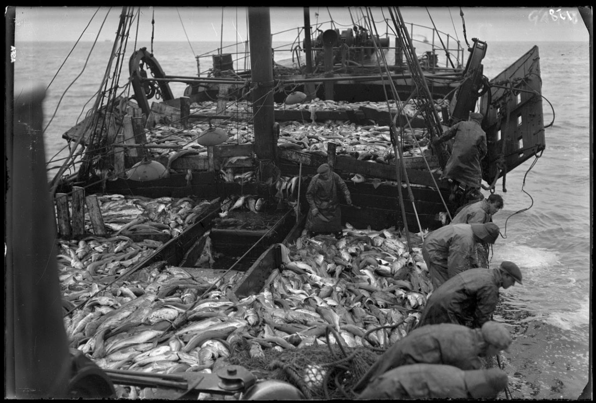 Tekið yfir þilfar á togara og er það fullt af fiski. Trollið við síðuna. Toghlerar í gálgum. Sjóklæddir menn á dekki.