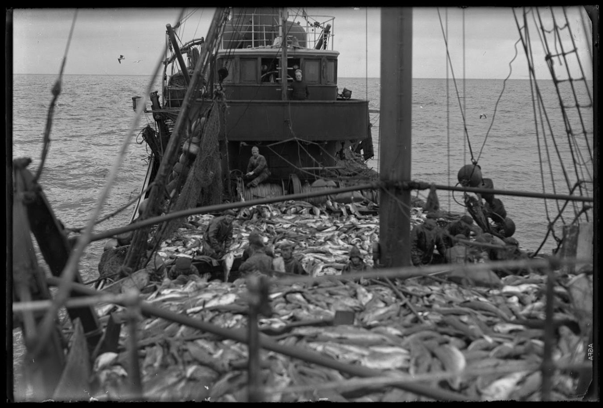 Tekið um borð í togara og sér aftur eftir þilfarinu, brú og brúarvæng. Mikill fiskur á dekki. Peysuklæddur maður á brúarvæng. Sjóklæddir menn á þilfari. Maður á samfestingi aftan við spil. Í forgrunni rekkverk (á hvalbak). Sjór í bakgrunni.