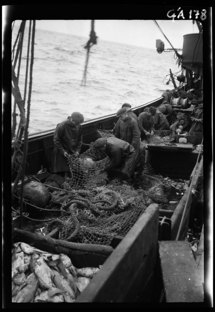 Um borð í togara. Tekið skáhallt aftur eftir skipinu. Menn á sjóstökkum að bæta troll. Einn á jakka eða búllu. Fiskur, hólfað dekk, spilkoppur, hluti af brúarvæng, lanterna. Sjór í bakgrunni.