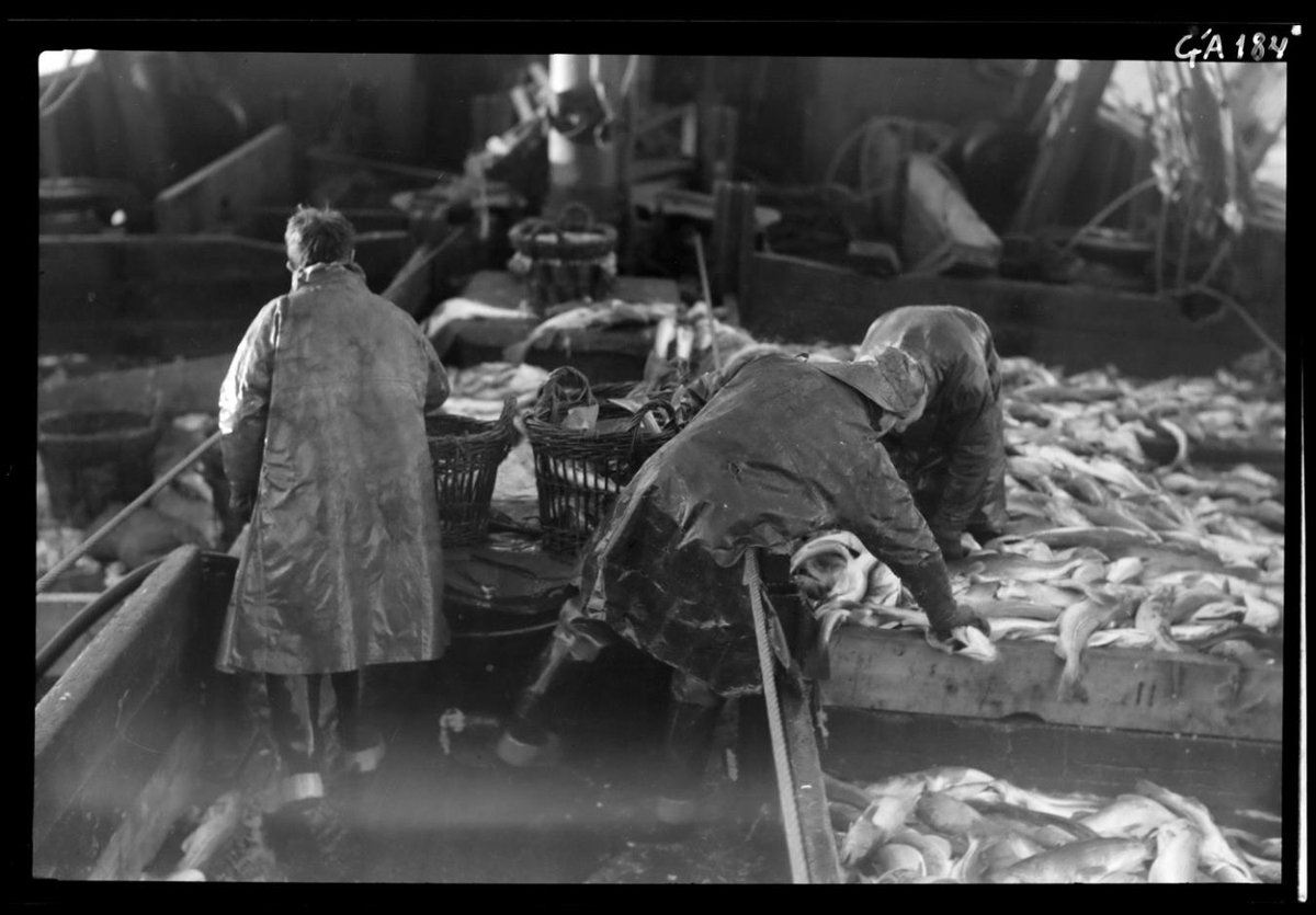 Um borð í togara. Sér aftur eftir þilfarinu sem er hólfað sundur. Fiskur í hólfum. Þrír menn á sjóstökkum og bússum í forgrunni. Einn berhöfðaður en hinn með sjóhatt. Tágakörfur tvær með fiski í. Vírar tveir liggja fram eftir skipinu. Bakgrunnur er hvalbakurinn, en fremur óskýr.