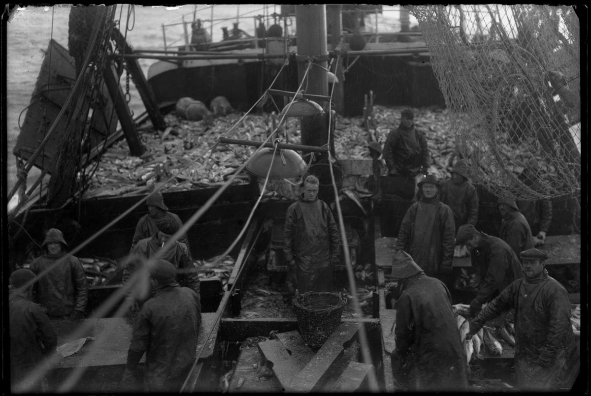 Um borð í togara. Sér fram eftir þilfarinu allt að hvalbak. Í forgrunni sjóklæddir menn við fiskaðgerð. Allir á stökkum, ýmist með derhúfur, hatta eða berhöfðaðir. Einn reykir sígarettu. Flatningsborð, tágakarfa, vinnuljós, toghleri, troll á lofti (.h.).