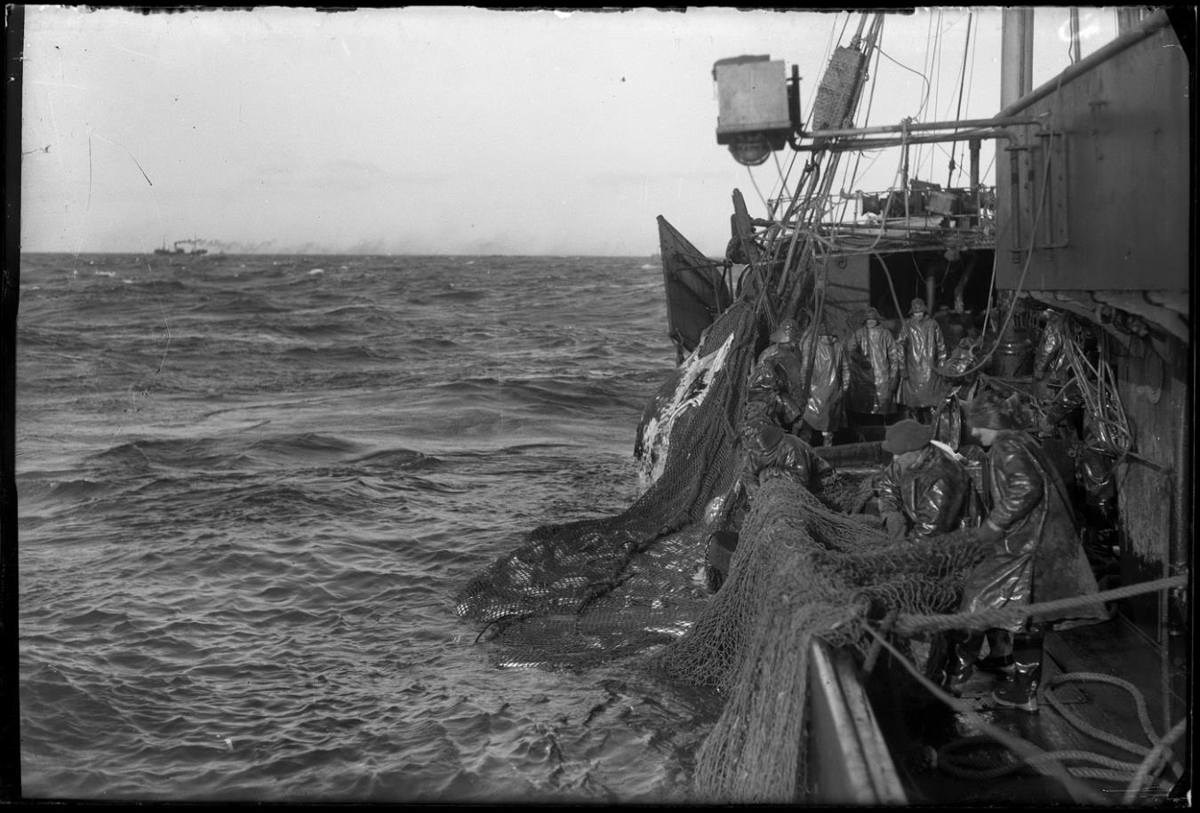 Togari að veiðum. Verið að taka inn pokann. Myndin tekin um borð og sér á skipið bakborðsmegin frá brúarvæng að bakka. Sjóklæddir (stakkar, bússur) menn á þilfari, þar af tveir aftast á skipinu sem toga í trollið. Annar þeirra með derhúfu, hinir með sjóhatta. Við sjóndeildarhring er togari á siglingu.