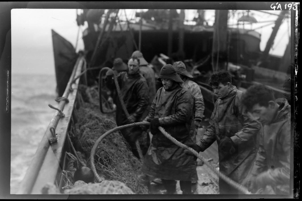 Um borð í togara. Sér fram eftir þilfarinu, einkum bakborðsmegin og að hvalbak. Sjóklæddir menn standa nálægt borðstokk og halda á sverum kaðli. Trollið liggur þar innan við borðstokkinn. Toghleri í gálga. Fremur grá mynd og fremri hluti skipsins úr fókus.