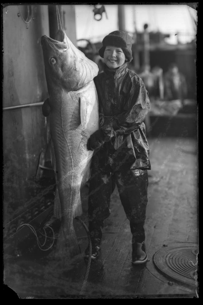Drengur á sjóklæðum, í ullarvettlingum og með loðhúfu, stendur við stóran þorsk sem hann styður við. Tekið um borð í togara, við keis, og sér óskýrt fram eftir skipinu. Þetta er Vigfús Sigurjónsson, albróðir heimildarmanns. Síðar skipstj. en nú látinn. Tekið um borð í Garðari GK 25 frá Hafnarf.