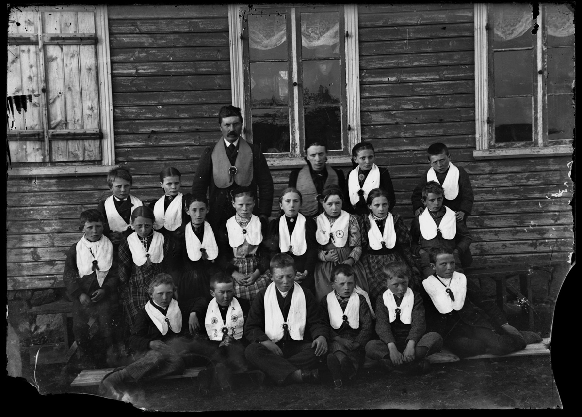 Hópur barna (18) með stúkukraga um hálsinn undir húsvegg. Karl og kona með annars konar stúkukraga aftan við hópinn. Barnastúka. Þekkja má konuna Önnu Guðjóhnsen Thoroddsen og út frá því má leiða líkur að því að myndin sé tekin í Keflavík undir vegg stúkuhúss Vonarinnar sem byggt var 1889 og stóð þar sem nú er Hafnargata 32.