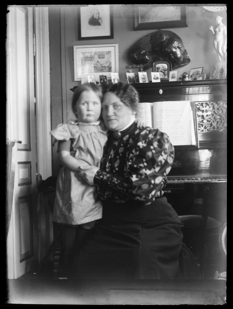 73. Kona heldur utan um litla stúlku inni í stofu. Píanó í bakgrunni og myndir ofan á því og á veggnum aftan við það. Helga Krabbe og Kristín Þorvaldsdóttir 1907.