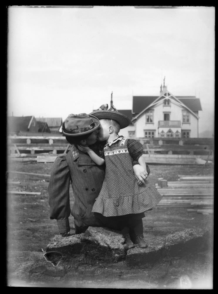 Lítil stelpa að faðma og kyssa konu. Timburstaflar í baksýn og hús. Helga